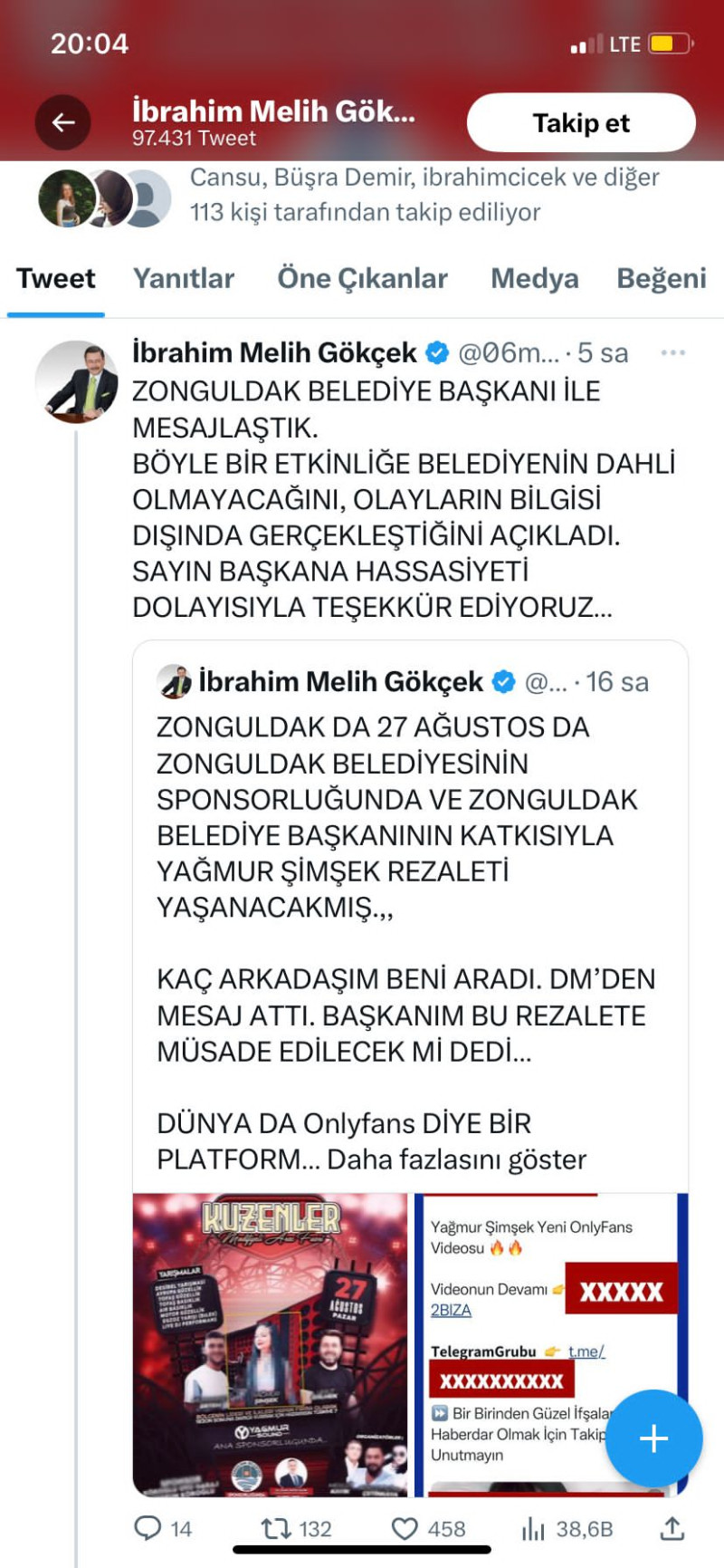 Ankara eski Büyükşehir Belediye Başkanı Melih Gökçek, Zonguldak Belediye Başkanı Selim Alan’ın polemiklere konu olan etkinlik konusunda hassasiyetinden dolayı teşekkür etti.