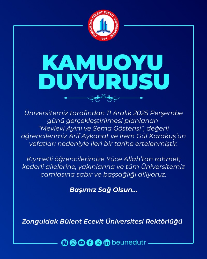 Zonguldak Bülent Ecevit Üniversitesi, 11 Aralık 2025 Perşembe günü gerçekleştirilecek olan “Mevlevi Âyini ve Sema Gösterisi”nin, öğrenciler Arif Aykanat ve İrem Gül Karakuş’un vefatı nedeniyle ileri bir tarihe ertelendiğini duyurdu.