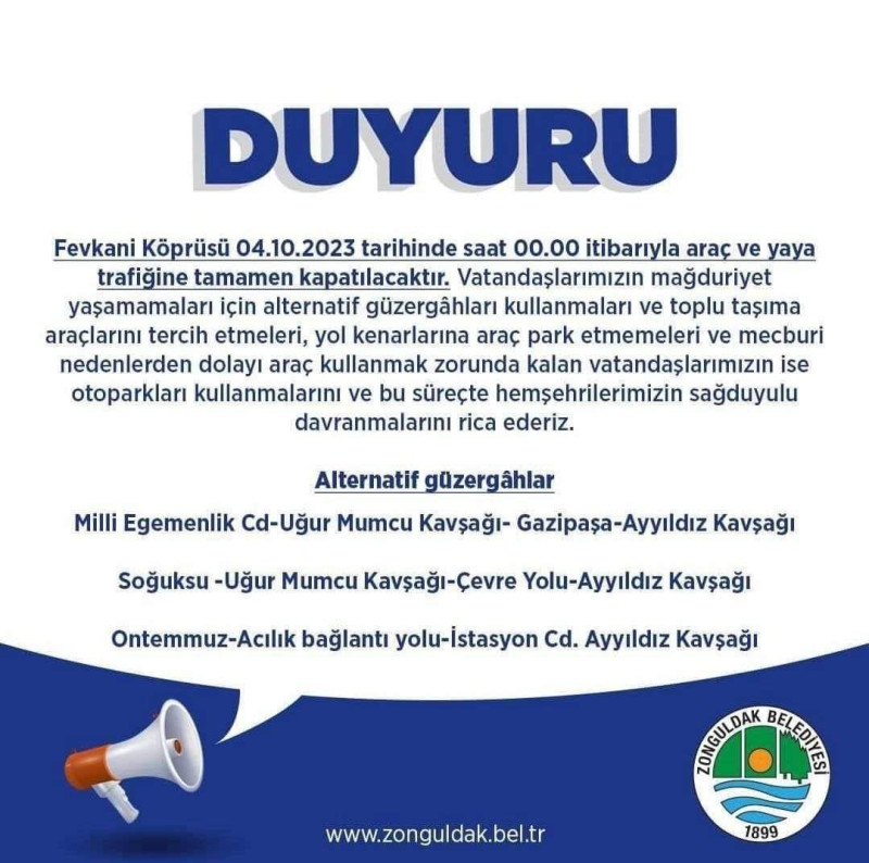 Zonguldak Belediyesinden yapılan açıklamayla 4 Ekim’de Fevkani Köprüsünün tamamen trafiğe kapanacağını açıkladı.