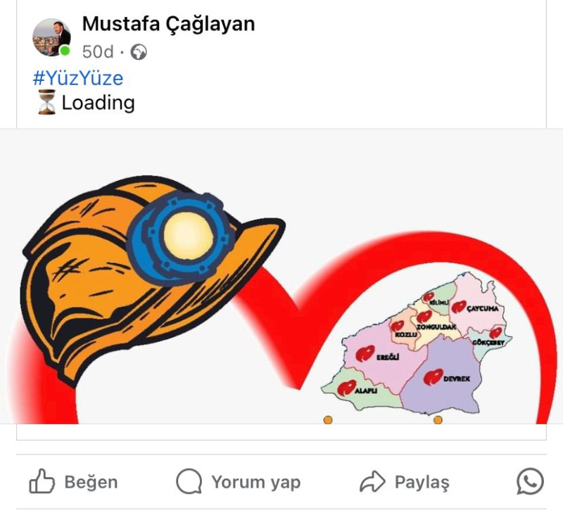 AK Parti Zonguldak İl Başkanı Mustafa Çağlayan sosyal medyada hesabında “Yüzyüze” ‘Yükleniyor!” başlığı ile madenci bareti, kalp ve Zonguldak haritasının kullanıldığı bir görseli paylaşarak merak uyandırdı.