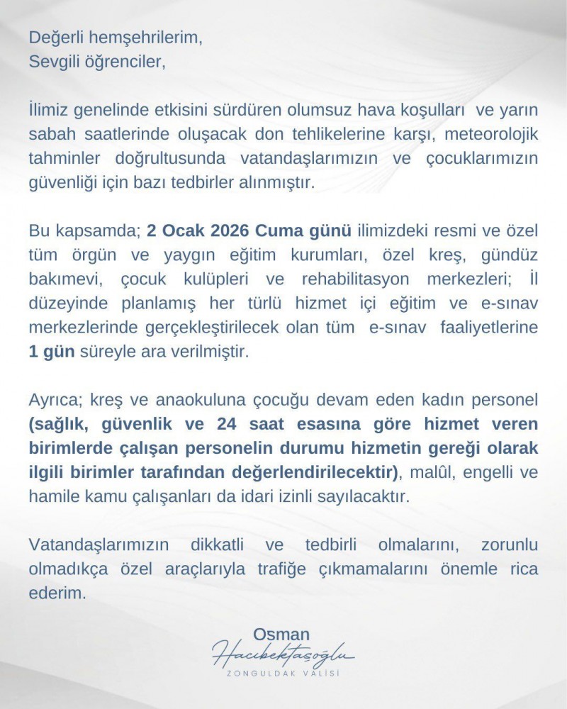 Zonguldak Valisi Osman Hacıbektaşoğlu, il genelinde etkili olan ve etkisini artırması beklenen kar yağışı nedeniyle 2 Ocak Cuma günü (yarın) eğitime 1 gün süreyle ara verildiğini açıkladı.