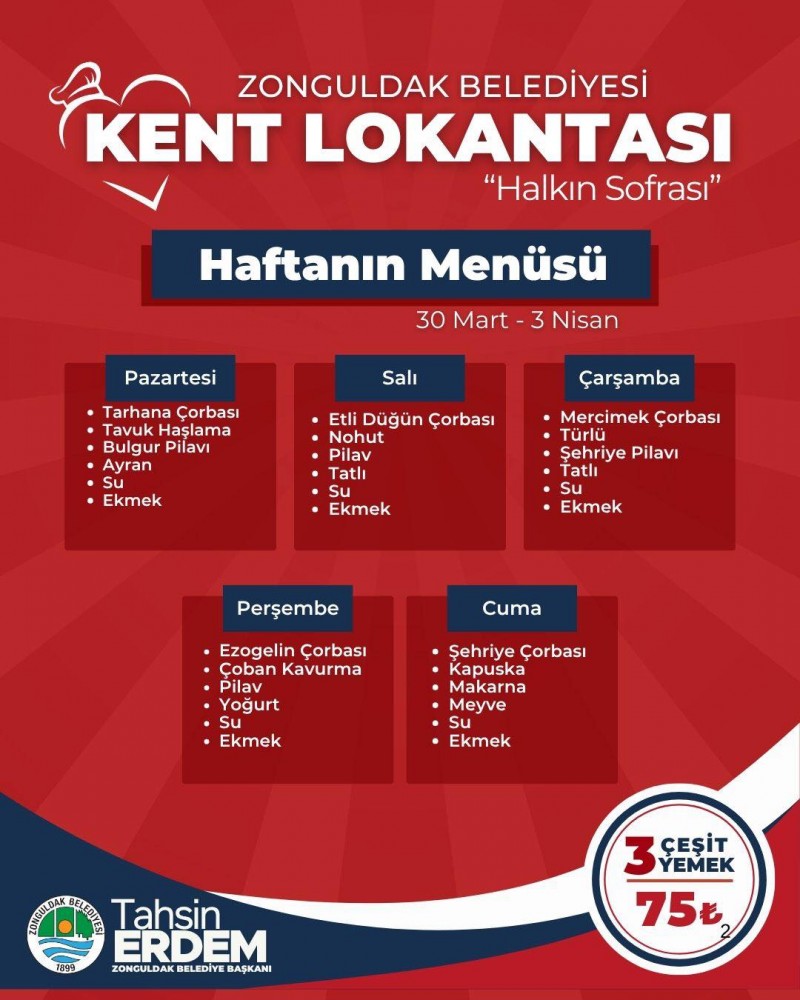 Zonguldak Belediyesi tarafından hizmete sunulan Kent Lokantası’nın 30 Mart – 3 Nisan tarihleri arasındaki haftalık menüsü belli oldu. “Halkın Sofrası” anlayışıyla vatandaşlara uygun fiyatlı ve sağlıklı yemek sunan lokantada, her gün farklı menüler yer alıyor.