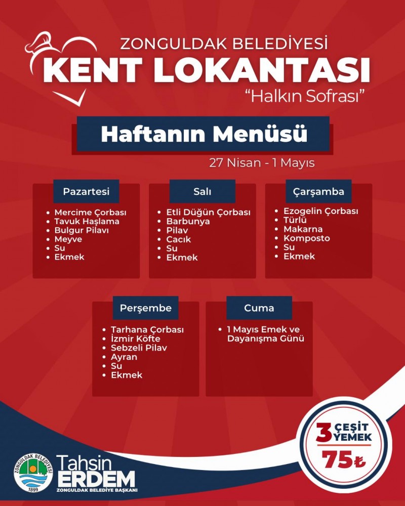 Zonguldak Belediyesi tarafından hizmete sunulan Kent Lokantası’nda 27 Nisan–1 Mayıs haftasının menüsü açıklandı. Uygun fiyatlı ve sağlıklı yemekleriyle dikkat çeken lokantada, hafta boyunca farklı lezzetler vatandaşlarla buluşacak.